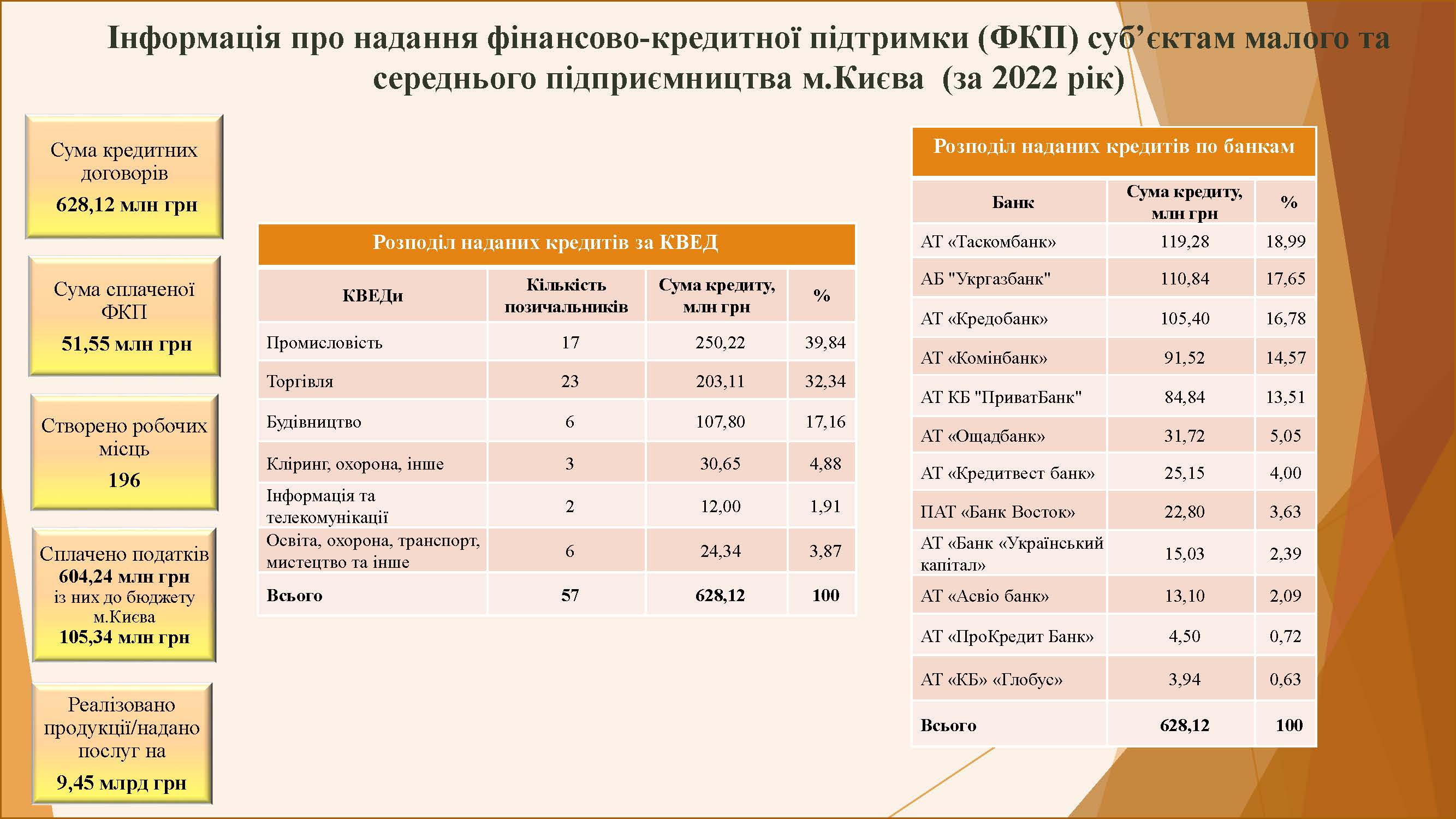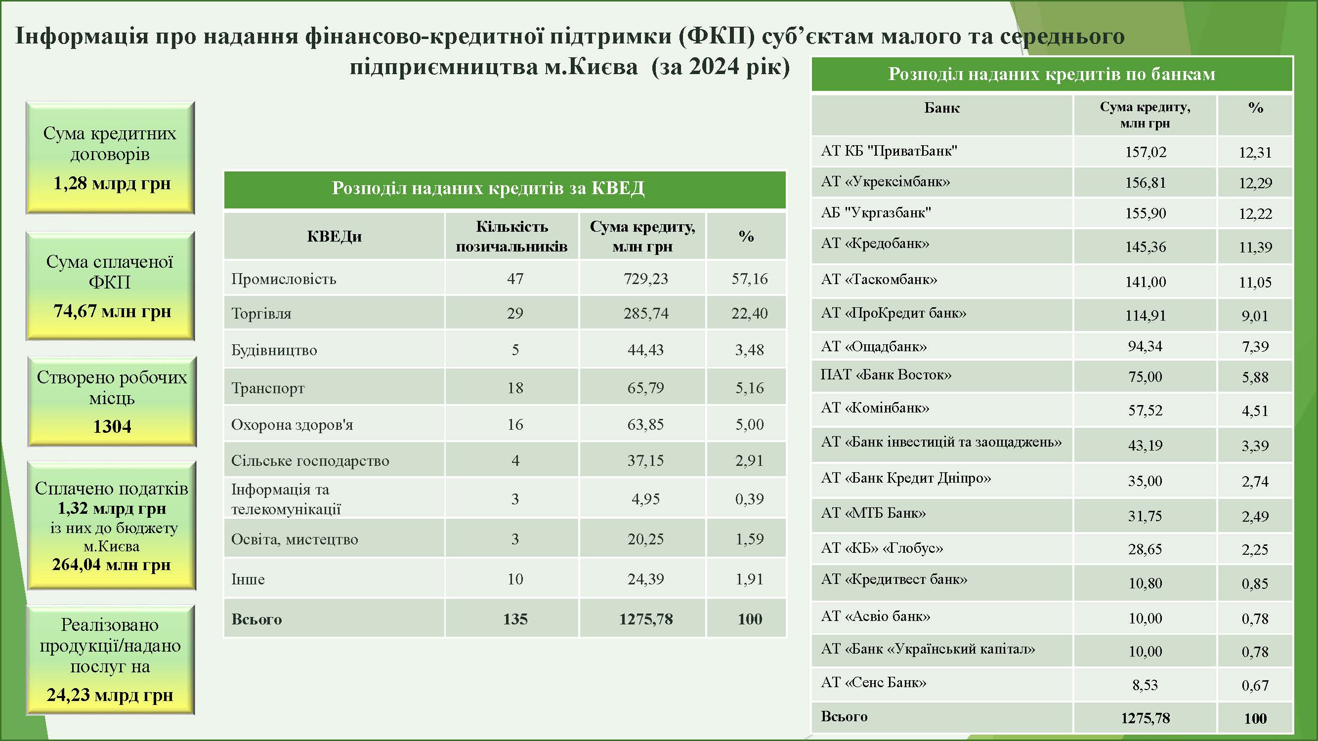 На сьогодні у програмі фінансово-кредитної підтримки суб’єктів малого та середнього підприємництва у місті Києві беруть участь наступні банки: АТ «ПРОКРЕДИТ БАНК», АБ «УКРГАЗБАНК», АТ «ОЩАДБАНК», АТ «КРЕДИТВЕСТ БАНК», АТ «КРЕДОБАНК», АТ КБ «ПРИВАТБАНК», АТ «КБ «ГЛОБУС», ПАТ «БАНК ВОСТОК», АТ «БАНК УКРАЇНСЬКИЙ КАПІТАЛ», АТ «ТАСКОМБАНК», АТ «КОМЕРЦІЙНИЙ ІНДУСТРІАЛЬНИЙ БАНК», АТ «АСВІО БАНК», АТ «УКРЕКСІМБАНК», ПАТ «МТБ БАНК», АТ «БАНК ІНВЕСТИЦІЙ ТА ЗАОЩАДЖЕНЬ», АТ «БАНК КРЕДИТ ДНІПРО», АТ «АКЦЕНТ- БАНК», АТ «СЕНС БАНК», АТ «АЛЬТ БАНК», АТ «ОКСІ БАНК» та АТ «АБ «РАДАБАНК».