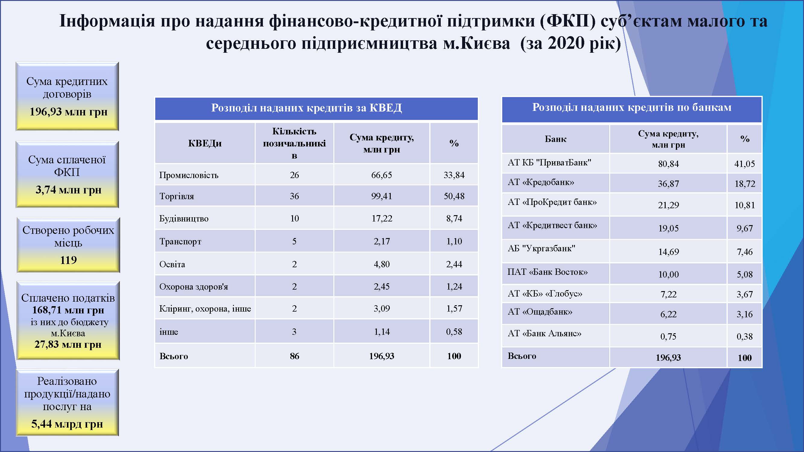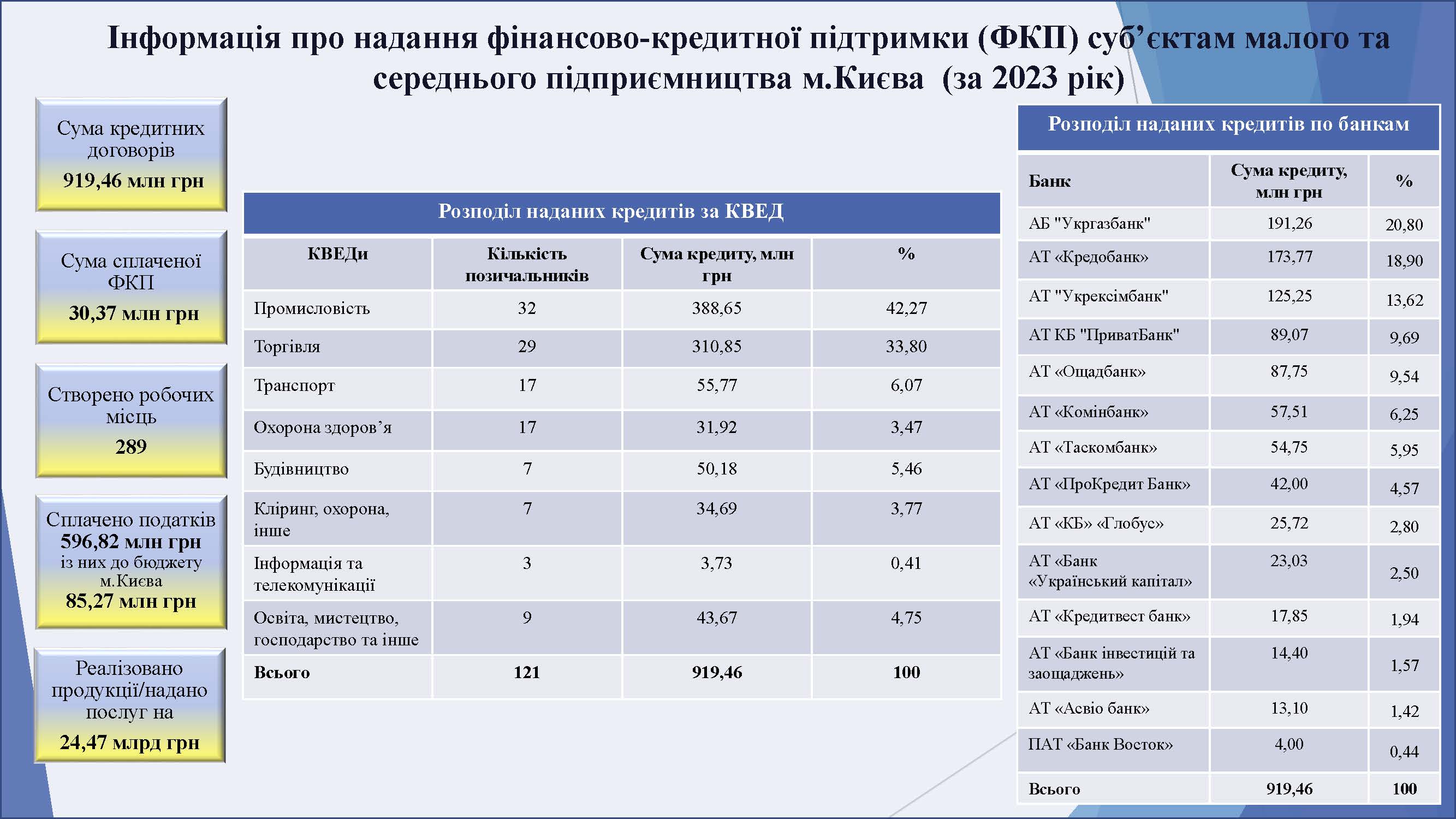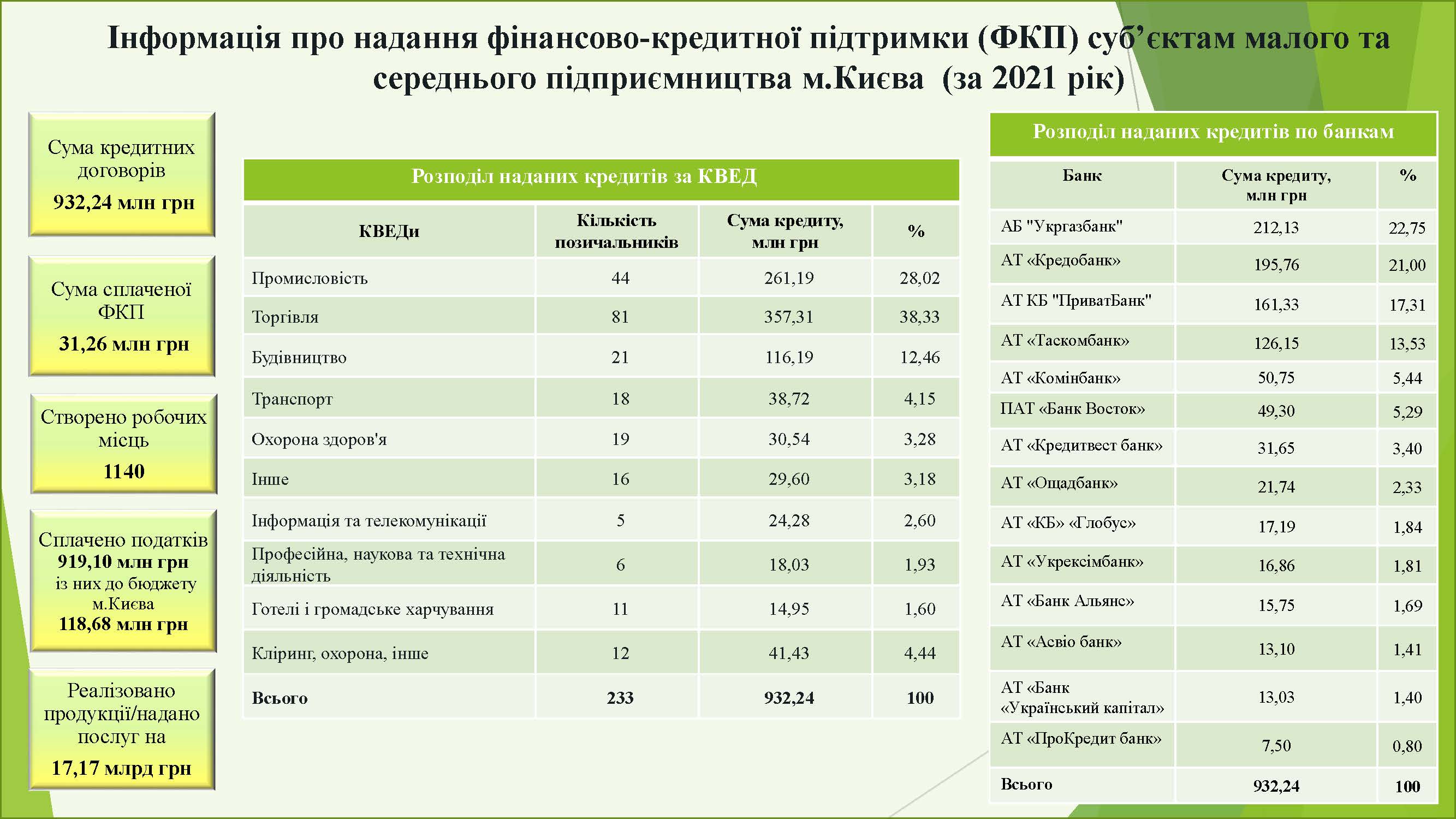 На сьогодні у програмі фінансово-кредитної підтримки суб’єктів малого та середнього підприємництва у місті Києві беруть участь наступні банки: АТ «ПРОКРЕДИТ БАНК», АБ «УКРГАЗБАНК», АТ «ОЩАДБАНК», АТ «КРЕДИТВЕСТ БАНК», АТ «КРЕДОБАНК», АТ КБ «ПРИВАТБАНК», АТ «КБ «ГЛОБУС», ПАТ «БАНК ВОСТОК», АТ «БАНК УКРАЇНСЬКИЙ КАПІТАЛ», АТ «ТАСКОМБАНК», АТ «КОМЕРЦІЙНИЙ ІНДУСТРІАЛЬНИЙ БАНК», АТ «АСВІО БАНК», АТ «УКРЕКСІМБАНК», ПАТ «МТБ БАНК», АТ «БАНК ІНВЕСТИЦІЙ ТА ЗАОЩАДЖЕНЬ», АТ «БАНК КРЕДИТ ДНІПРО», АТ «АКЦЕНТ- БАНК», АТ «СЕНС БАНК», АТ «АЛЬТ БАНК», АТ «ОКСІ БАНК» та АТ «АБ «РАДАБАНК».