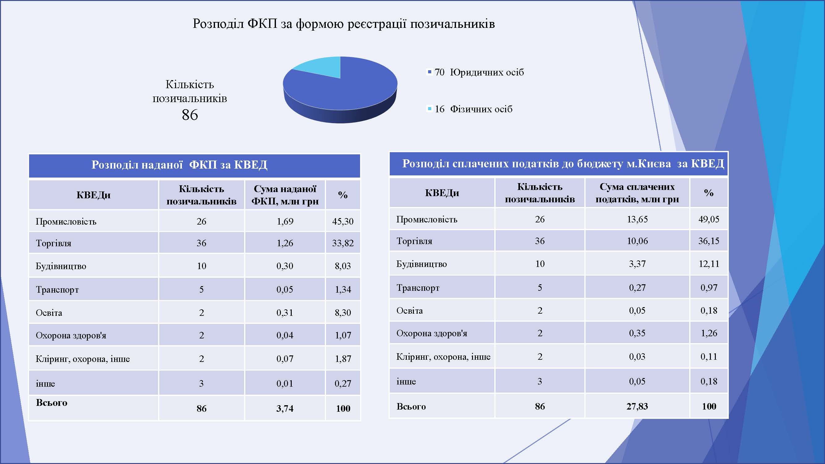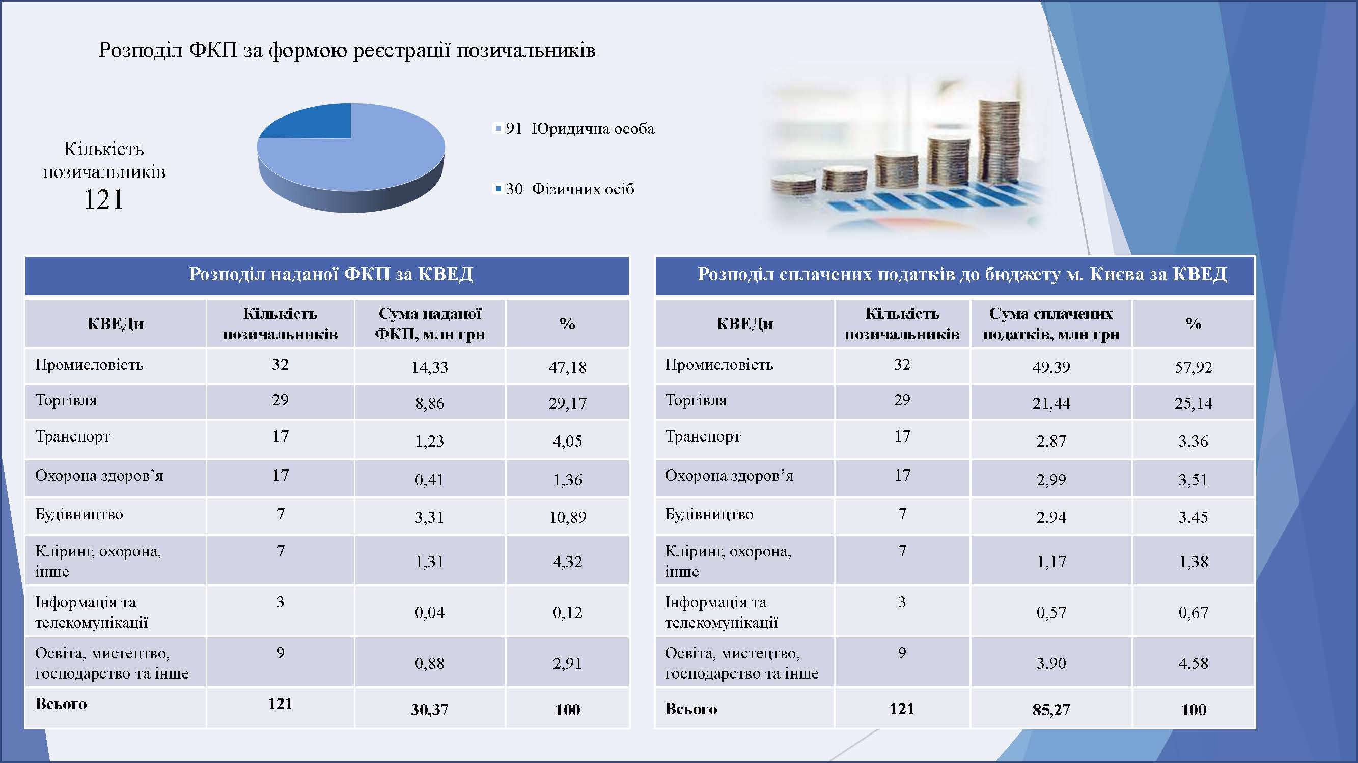 Згідно з рішенням Київської міської ради від 30.05.2024 № 471/8437, «Про питання надання фінансово – кредитної підтримки суб’єктів малого та середнього підприємництва у місті Києві в умовах воєнного стану» встановлено, що з 01 червня 2024 року на час дії воєнного стану та 90 календарних днів після його припинення чи скасування, ФКП надається суб’єктам малого та середнього підприємництва у місті Києві, які здійснюють свою основну діяльність, визначену в Єдиному державному реєстрі юридичних осіб, фізичних осіб-підприємців та громадських формувань, відповідно до КВЕД 2010 секція С «Переробна промисловість» клас 30.30 «Виробництво повітряних і космічних летальних апаратів, супутнього устаткування».